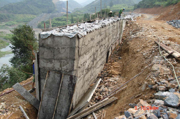 擋墻砌筑應(yīng)分層,每一砌筑層擺石時(shí)均應(yīng)座漿,隨鋪漿隨砌筑。嚴(yán)禁石塊大面無漿直接貼靠。混凝土必須用振搗器逐縫振搗。當(dāng)豎縫寬度在5cm以上時(shí),可填漿后塞片石。嚴(yán)禁先堆砌石塊再用膠結(jié)料灌縫。